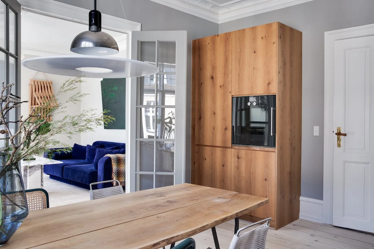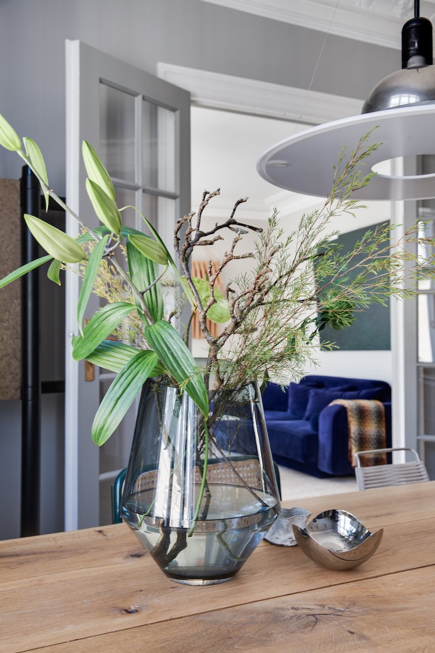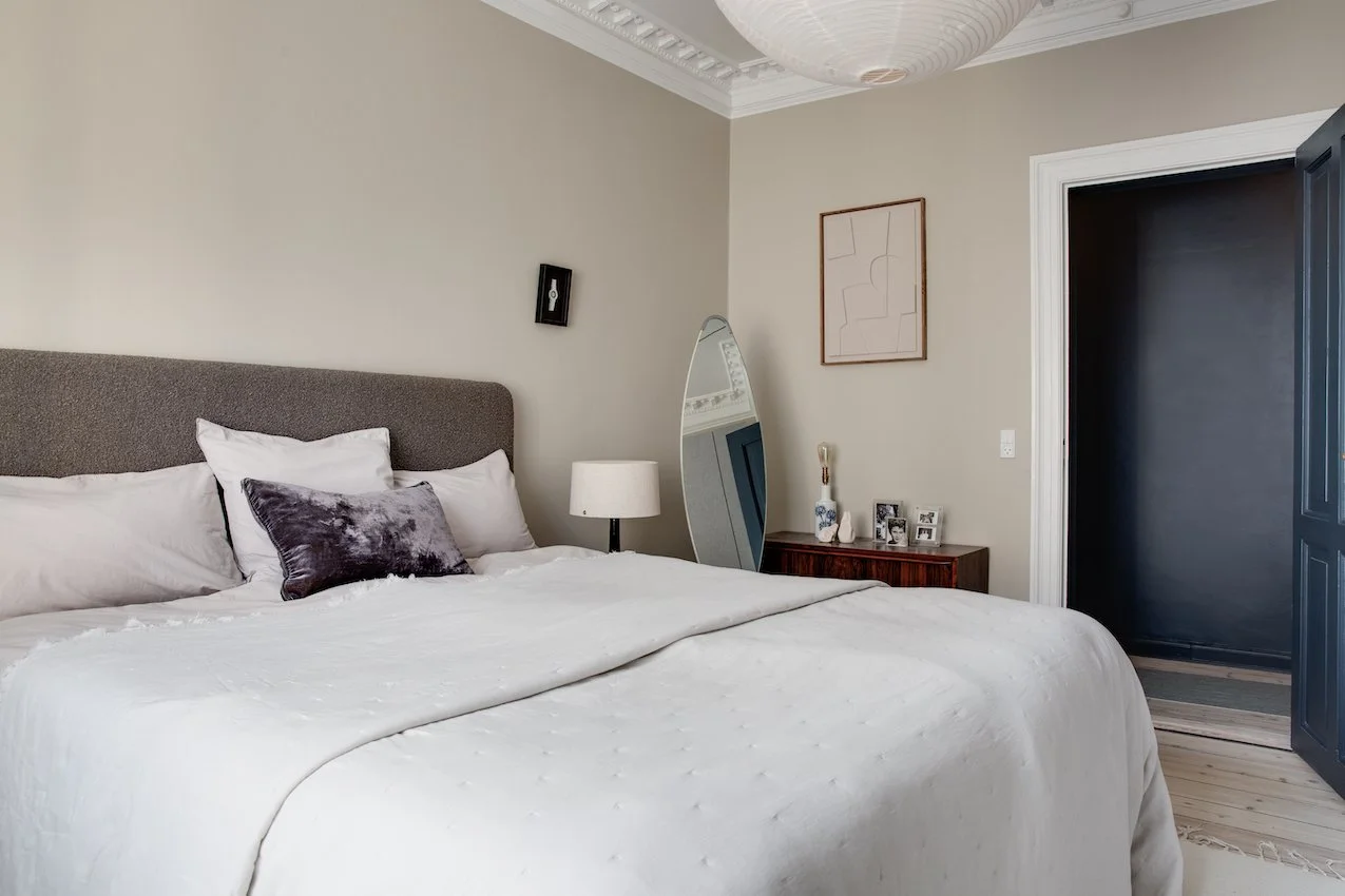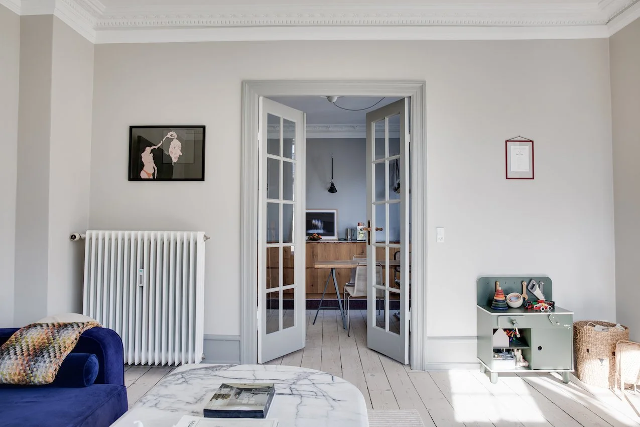 I en klassisk Københavner-ejendom fra 1907 på en af Indre Østerbros mest attraktive gader, ligger denne fashionable lejlighed. Den blå entre er det første der møder dit øje og det første bevis på den charmerende elegance der gennemsyrer lejligheden.