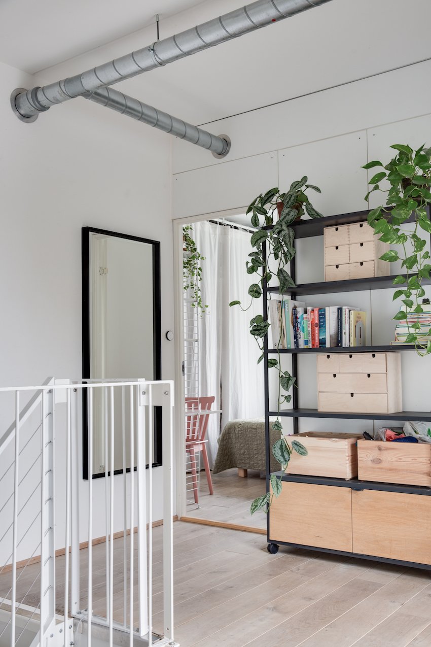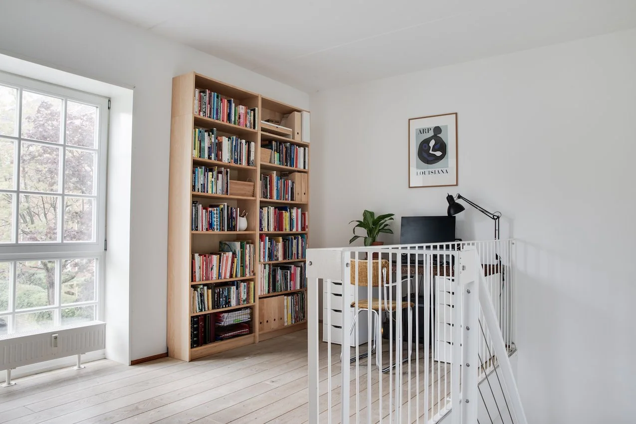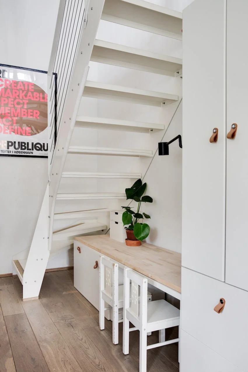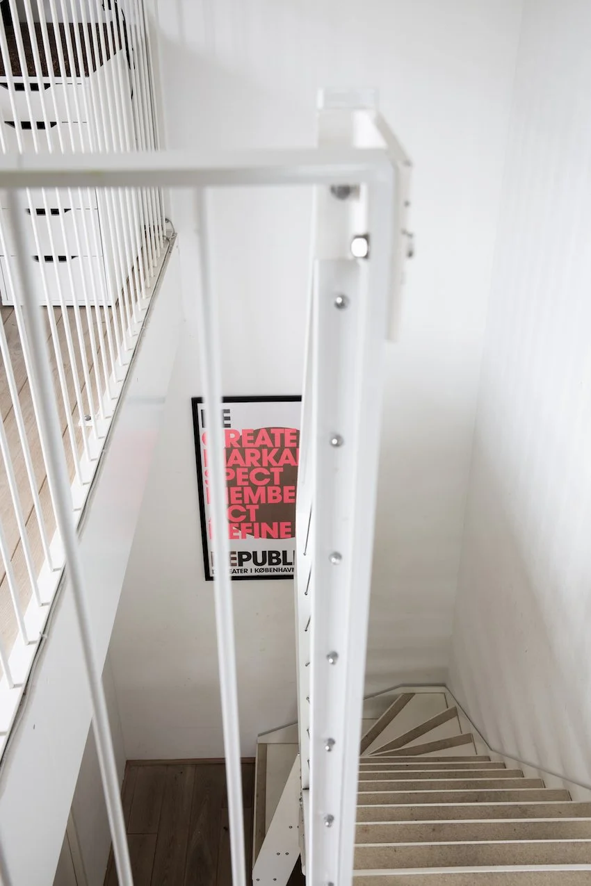 Den grafiske hvide ståltrappe, leder op til en stor repos hvor der er indrettet et hjemmekontor og bibliotek. Heroppe ligger også lejlighedens to soveværelser, der begge har fin udsigt til grønne Prags Boulevard. Badeværelset matcher lejlighedens skandinaviske stilrenhed med kvalitetsmaterialer, skøn gulvvarme samt vaskesøjle.