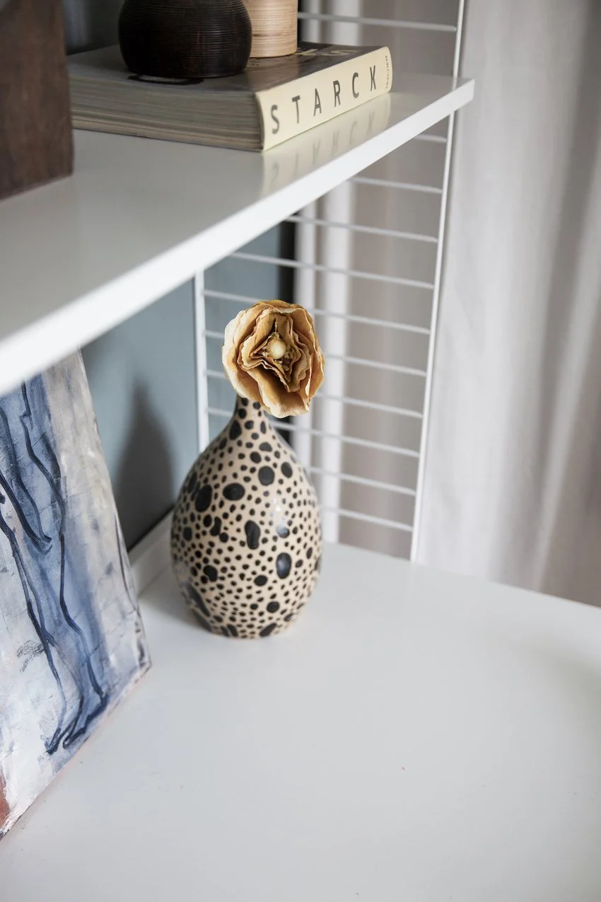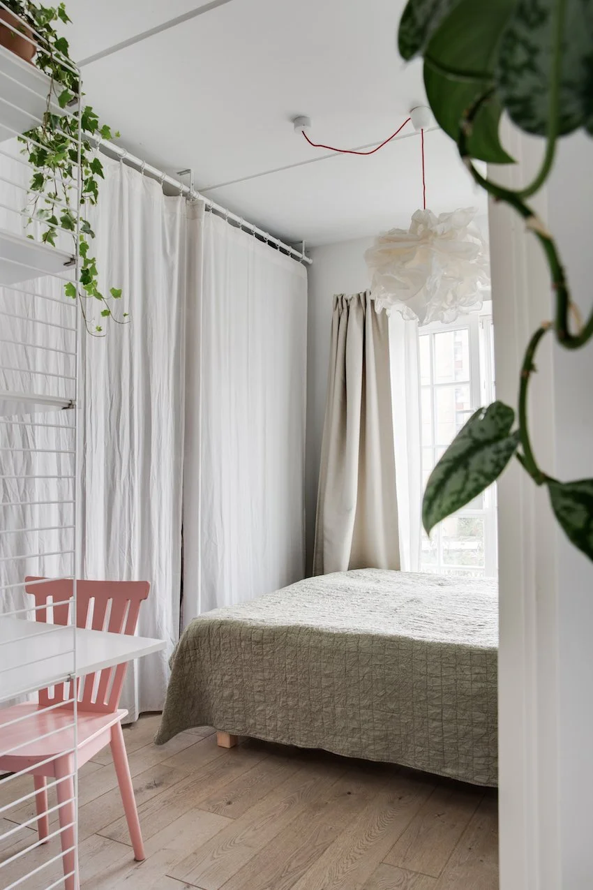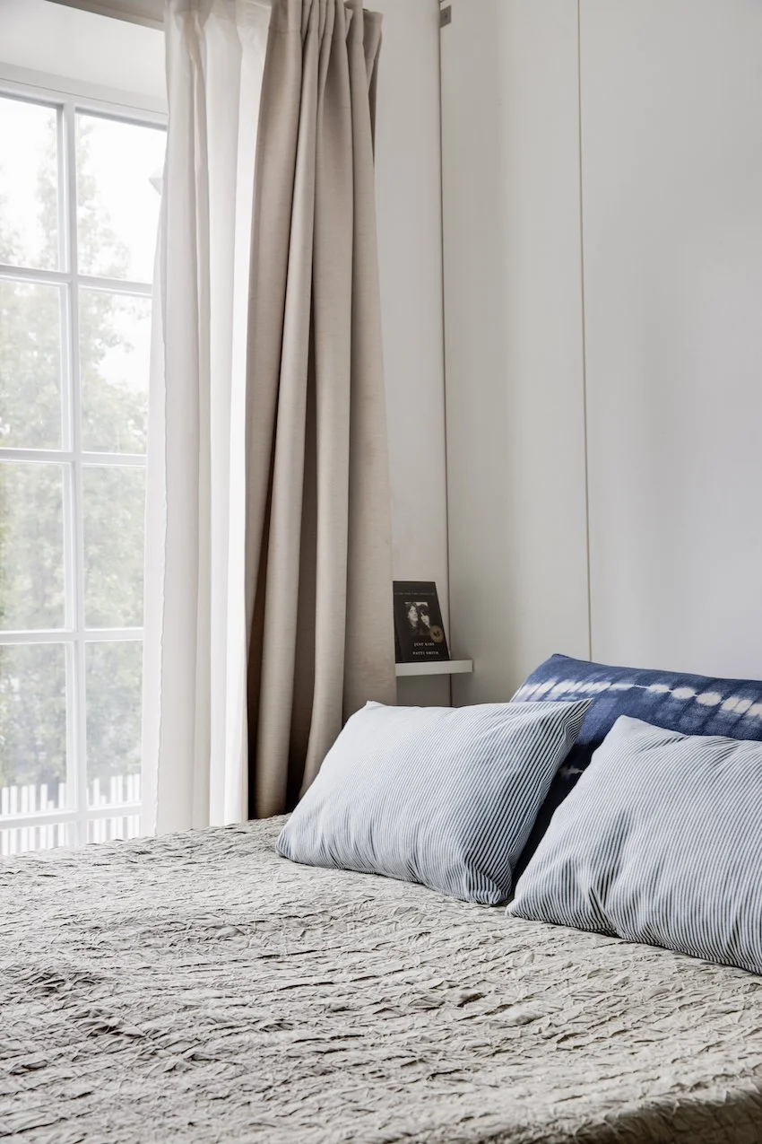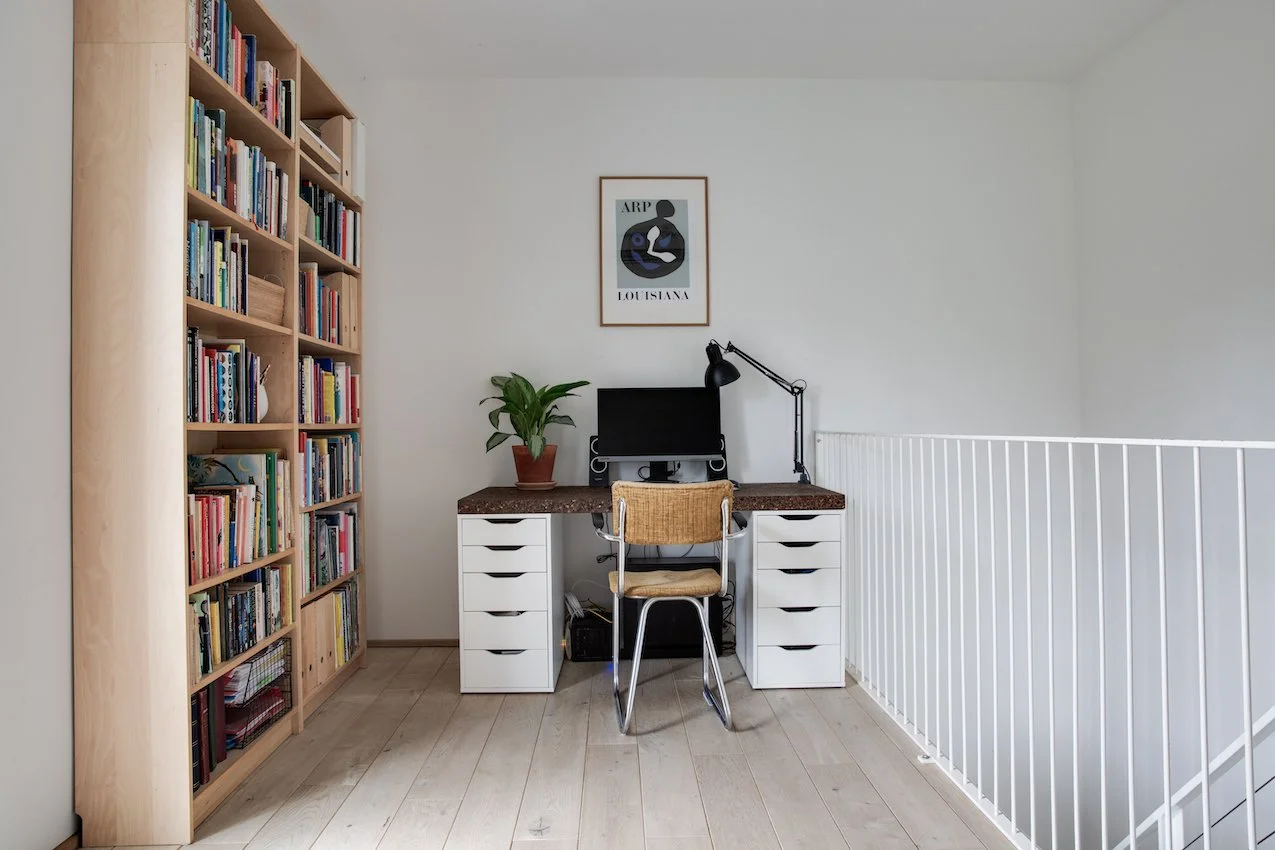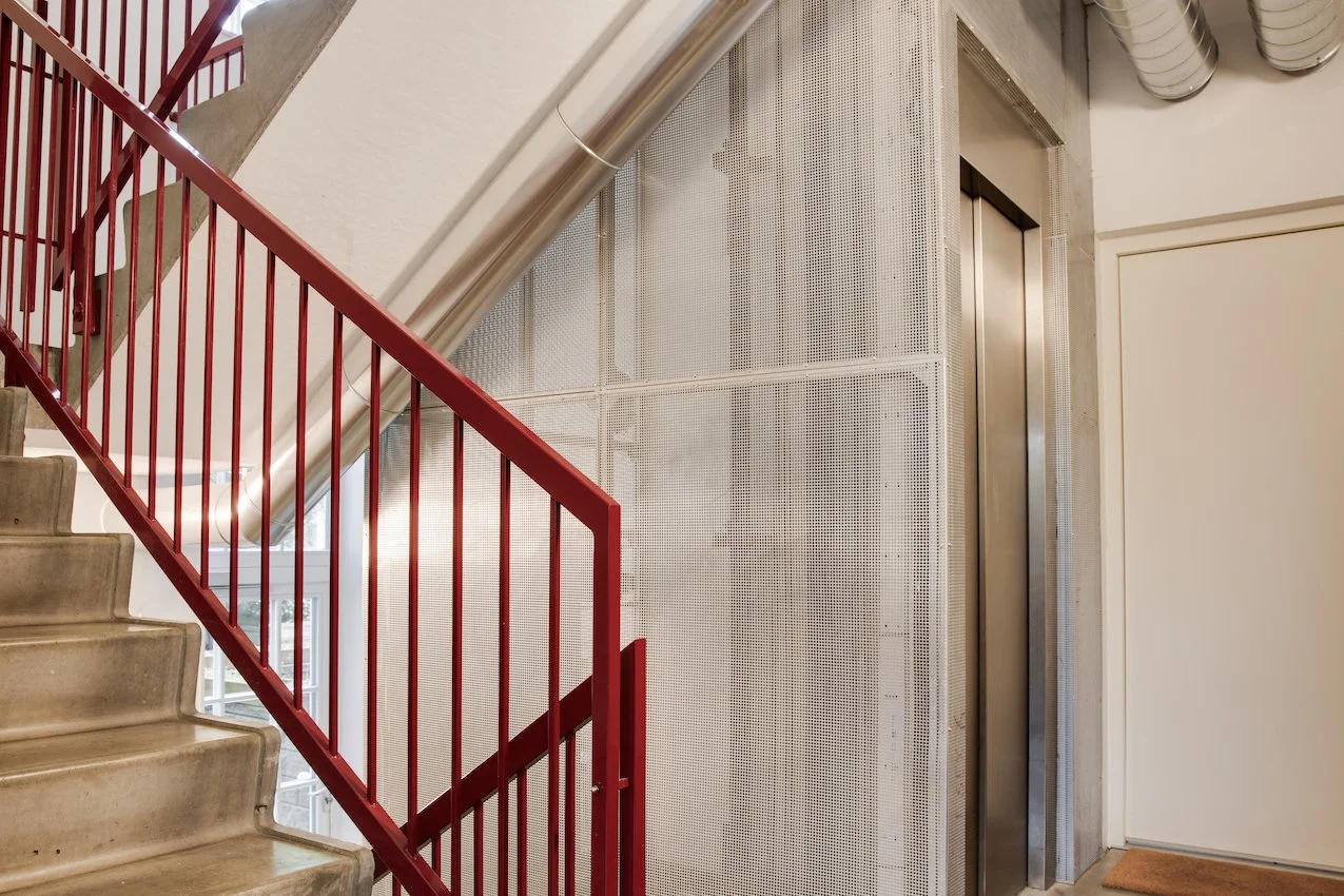 Den grafiske hvide ståltrappe, leder op til en stor repos hvor der er indrettet et hjemmekontor og bibliotek. Heroppe ligger også lejlighedens to soveværelser, der begge har fin udsigt til grønne Prags Boulevard. Badeværelset matcher lejlighedens skandinaviske stilrenhed med kvalitetsmaterialer, skøn gulvvarme samt vaskesøjle.