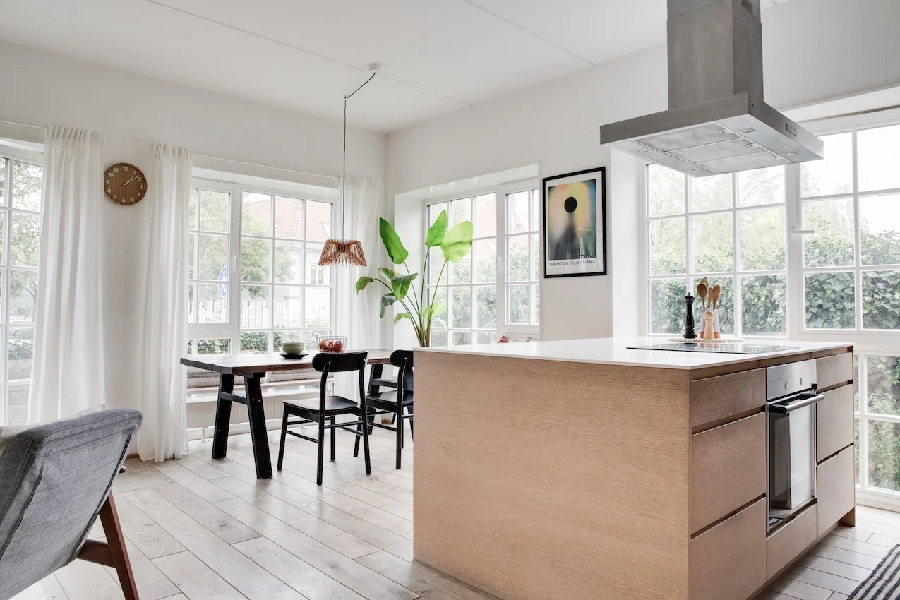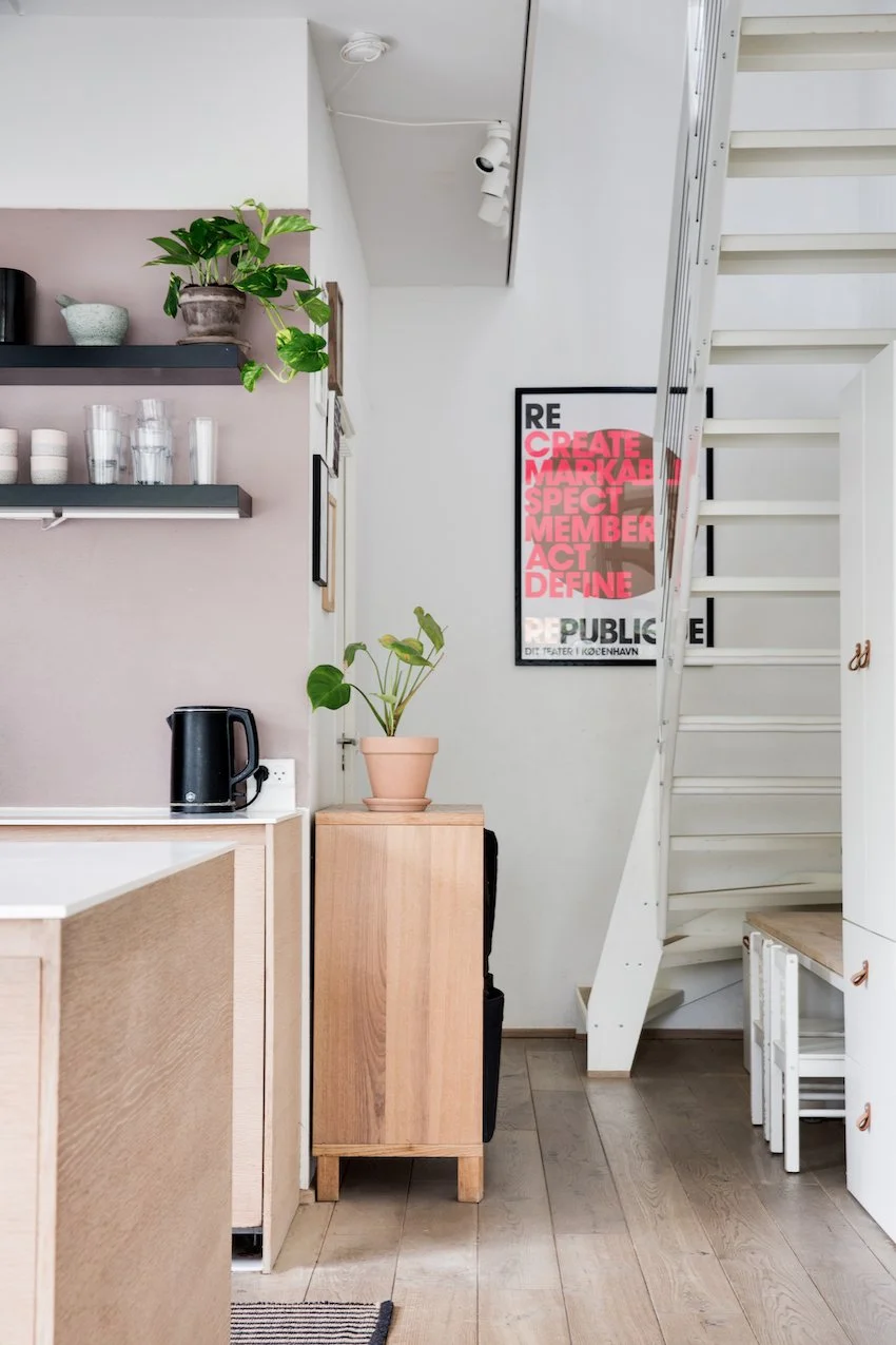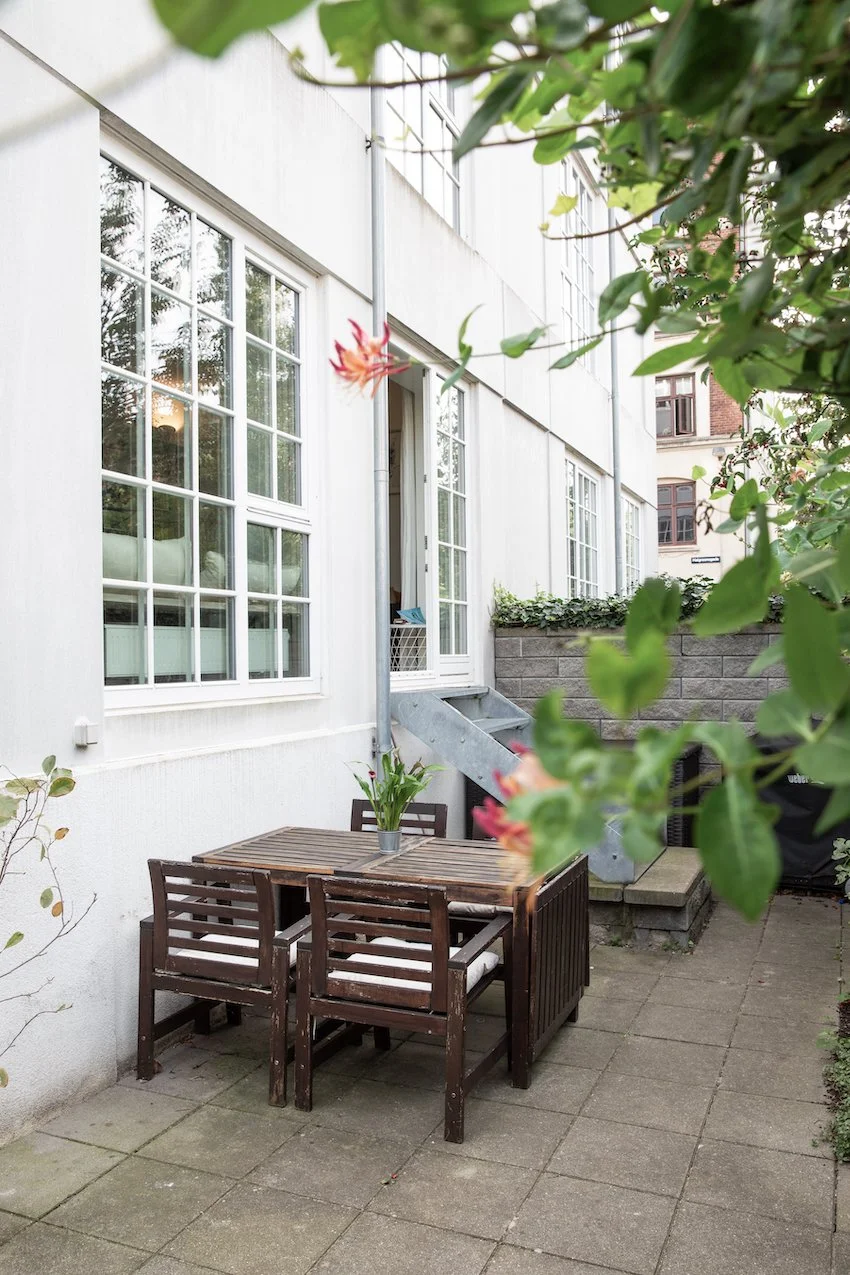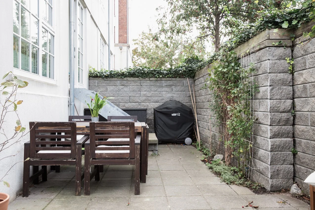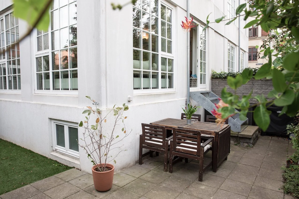 Det er et moderne og funktionelt hjem med udtryksfulde detaljer, og geometriske linjer. De 104 kvadratmeter er intelligent udnyttet og smagfuldt indrettet med materialer som stål, glas, beton og træ. Entrédøren åbner op til et indbydende køkken / alrum og stue i ét, lejlighedens hjerte. Køkkenet fra Køkkensnedkeren, emmer af kvalitet og tilføjer en særlig skandinavisk varme. Fra stuen er der direkte udgang til lejlighedens private og hyggelige gårdhave.