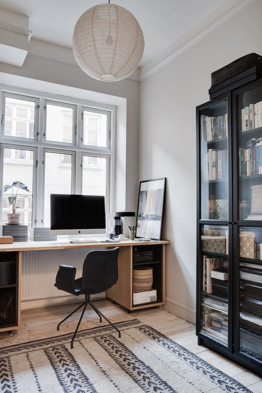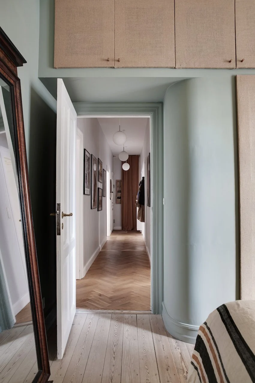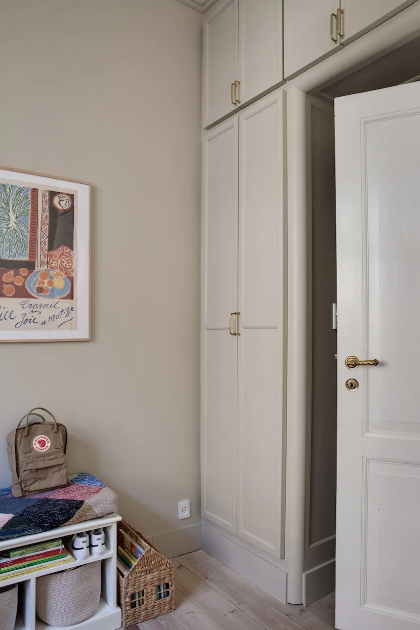 Nr. 46 ligger i en særegen ejendom fra 1918, der har en varm mørkerød murstensfacade, og fine buede vinduer. Nogle enkelte trin op leder dig ind til denne høje stuelejlighed, hvor du mødes af en varm og indbydende stemning.