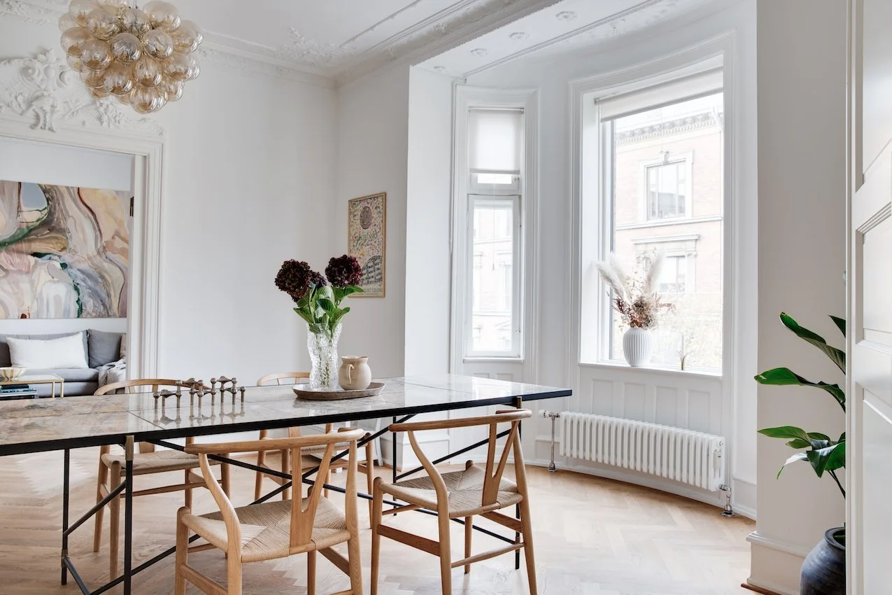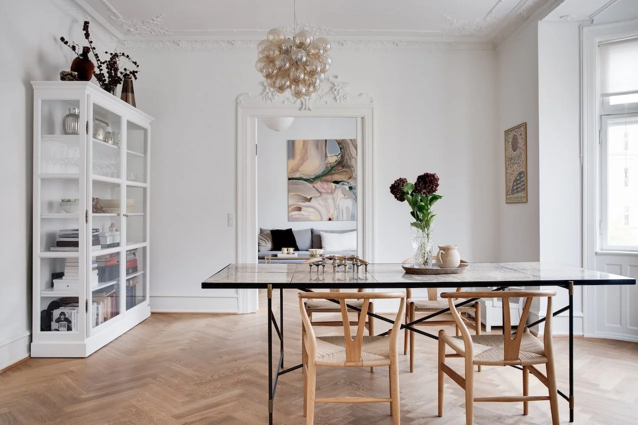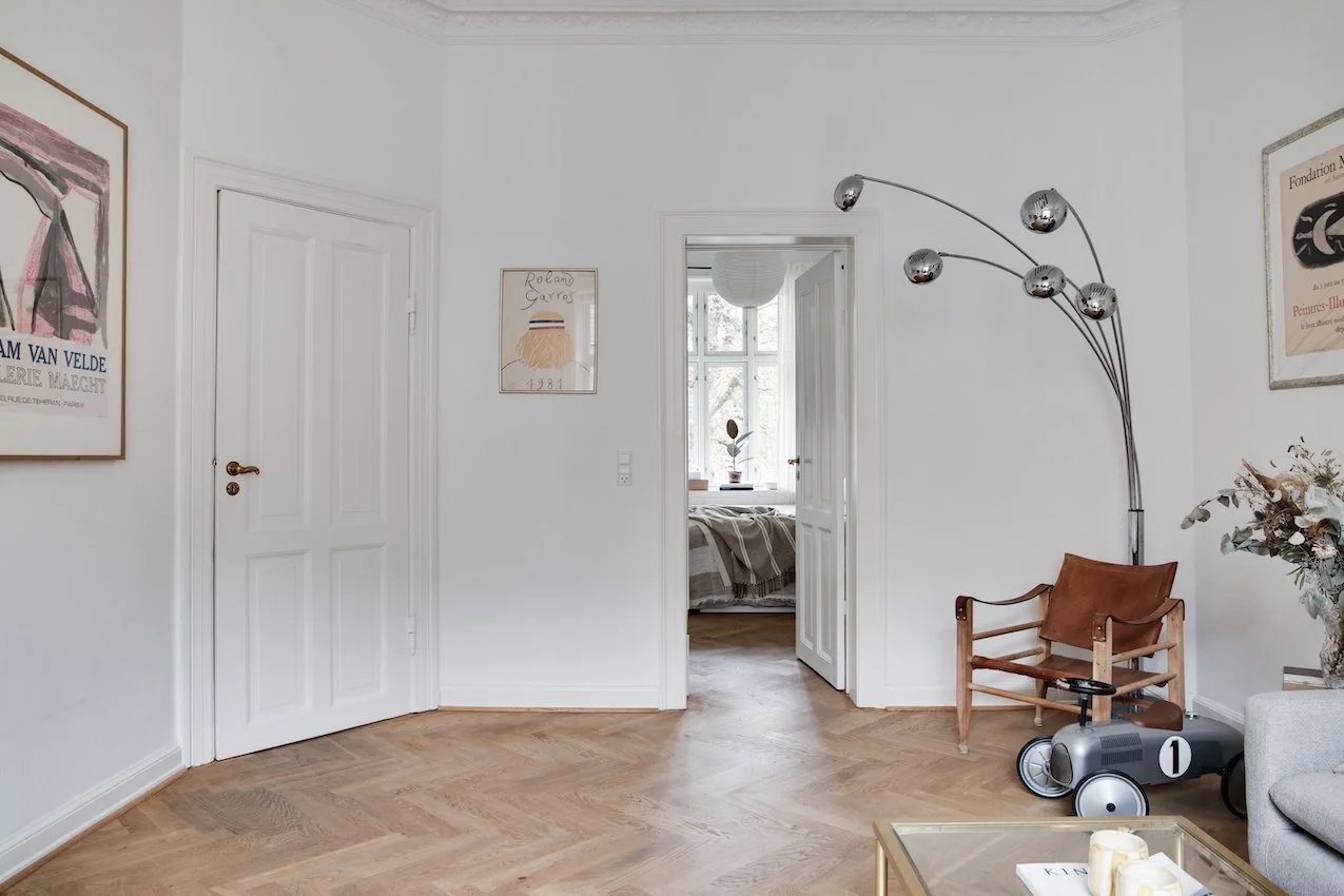 Lejlighedens 112 kvm starter i en indbydende entré der fører dig videre ind til de smukt istandsatte værelser. Her vil du opleve det særlige møde mellem klassisk herskabelighed og nordisk æstetik. Værelserne er blevet nænsomt renoveret, og med en stærk sans for ejendommens historie. Her er anvendt materialer i høj kvalitet der fremhæver og forstærker de originale detaljer. Den fabelagtige stukkatur og de dekorative fyldningsdøre, har fået selskab af flot sildebensparket i egetræ, eksklusive fliser og vask fra Aquadomo, armaturer og Quooker i messing, hvidevarer fra Miele, samt et lækkert snedkerkøkken fra Handcrafted Interior med marmor bordplade.