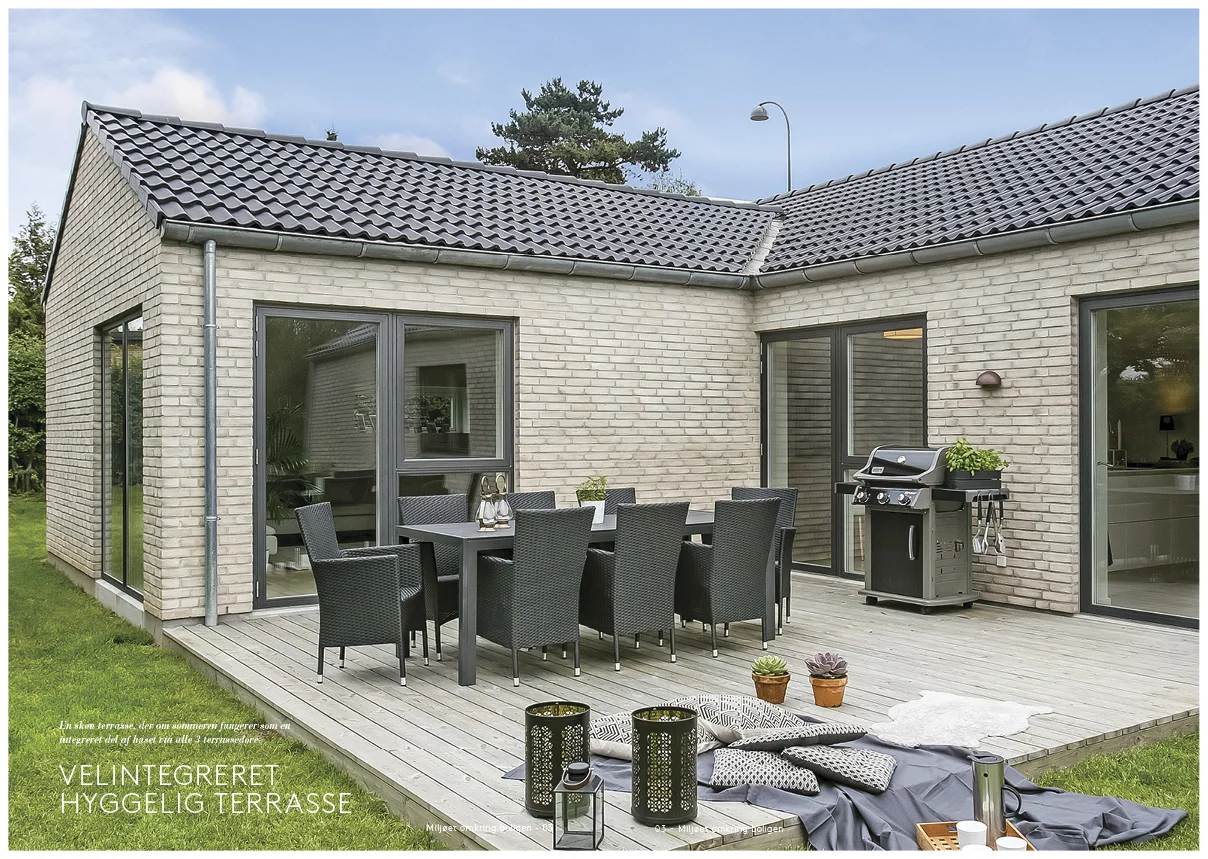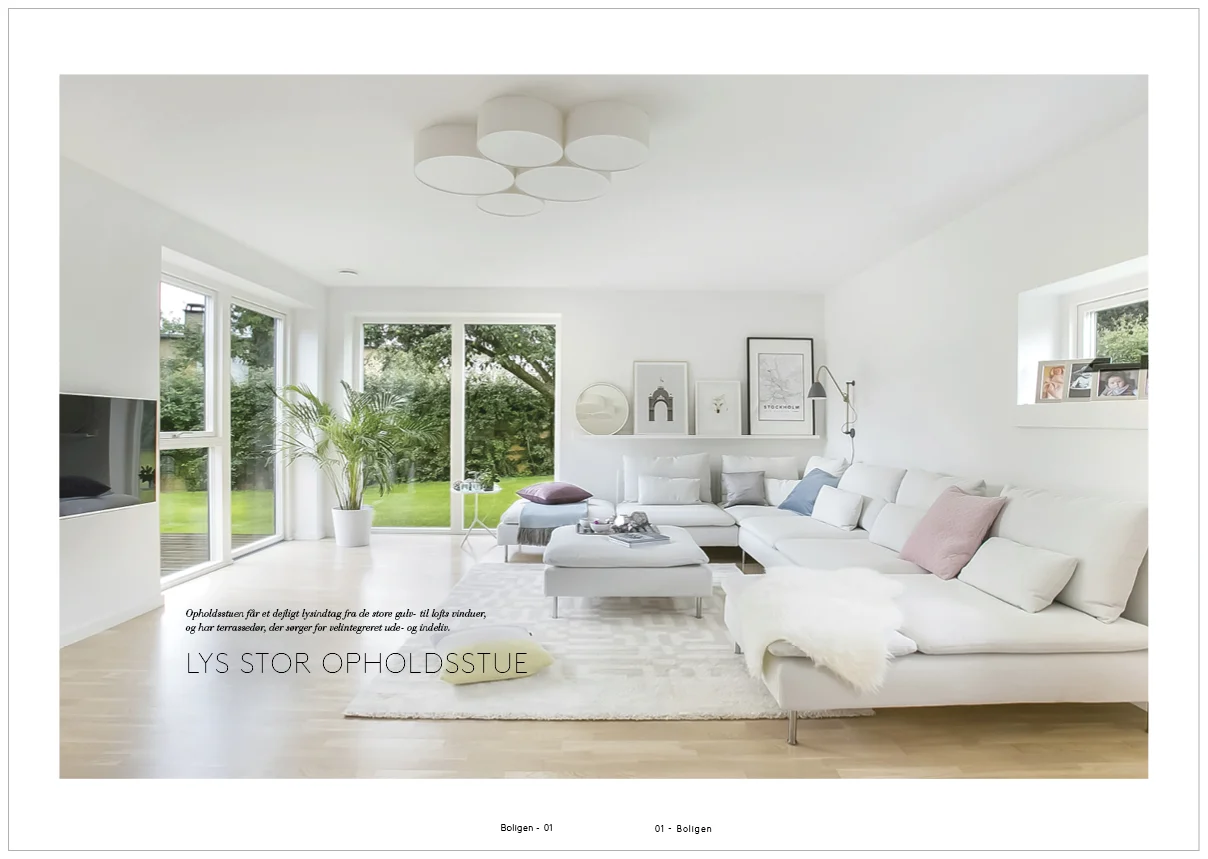 Et topmoderne allergivenligt nyt hus, med plads til den store familie, indrettet med en gennemtænkt planløsning, hvor der i den ene ende af huset er master afdeling, med skønt stort soveværelse og master badeværelse en-suite. I den anden ende finder man 2 skønne børneværelser samt gæstesoveværelse. Derudover et stort lyst badeværelse perfekt placeret mellem de 3 værelser. Denne del af huset indeholder ligeledes et skønt stort åbent aktivitetsrum, som samler fløjen. Aktivitetsrummet har god plads til hygge og leg, placeret lige op af køkkenet således at der altid er mulighed for tæt kontakt trods forskellige aktiviteter. Huset har fokus på samvær, men med rigtig god plads og mange værelser. Der er lagt vægt på at skabe god integration af haven og terrassen bl.a. via terrassedøre fra både køkken, alrum og stue.