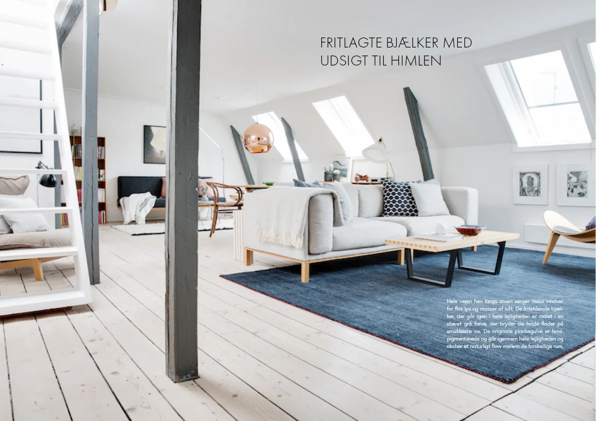 Lejligheden rummer to soveværelser, et lækkert badeværelse med badekar og vaskesøjle samt et stort åbent køkken. Overalt er der lyst og indbydende, og de mange Velux vinduer sørger for frit udsyn til himlen.