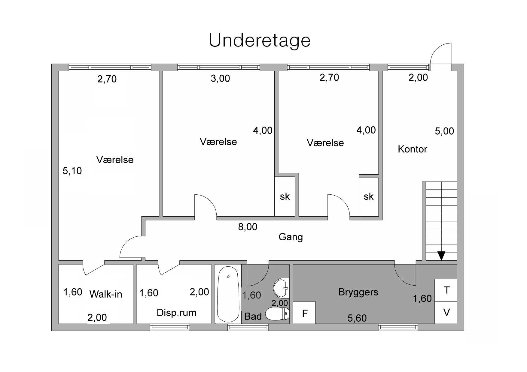 Huset rummer en overetage med entre og gæstetoilet, køkken-alrum med udgang til den øverste træterrasse og opholdsstue med udgang til forhaven. I underetagen finder man husets soveafdeling med to gode børneværelser, et mastersoveværelse med walk-in-closet, badeværelse og bryggers. Fra underetagen er der udgang til den store træterrasse, som ligger på skrænten i den 900 kvm store skov, der hører til huset.