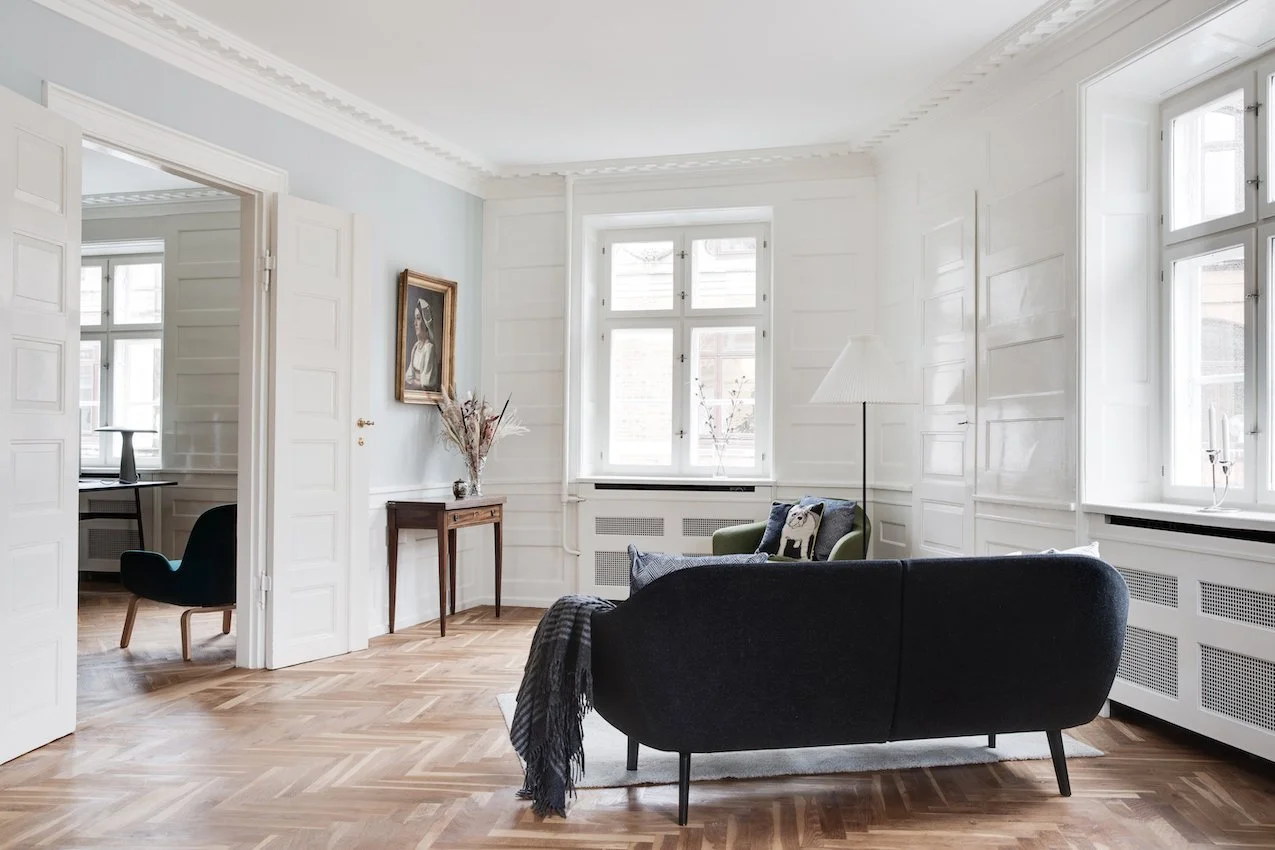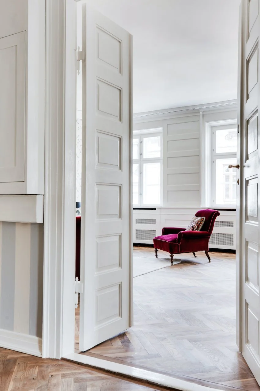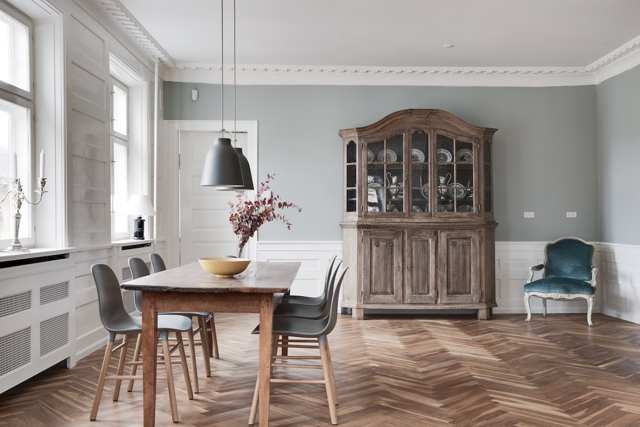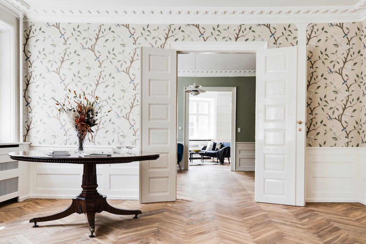 Stilen fortsætter inde i lejligheden, hvor den løftes til et endnu højere niveau. Her venter et eksklusivt hjem på 202 kvm, som er renoveret til perfektion, men med sans for de herskabelige detaljer. Hjemmets udsøgte materialer, som det smukke sildebensparket i eg, og de velvalgte farver og tapeter fra Tapet Café, får lejligheden til at fremstå som et unikt og personligt hjem.