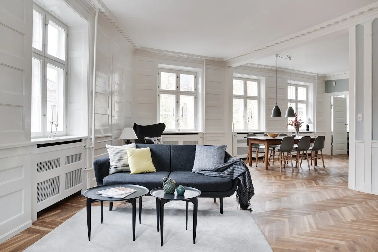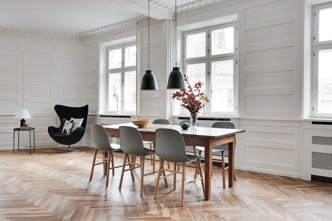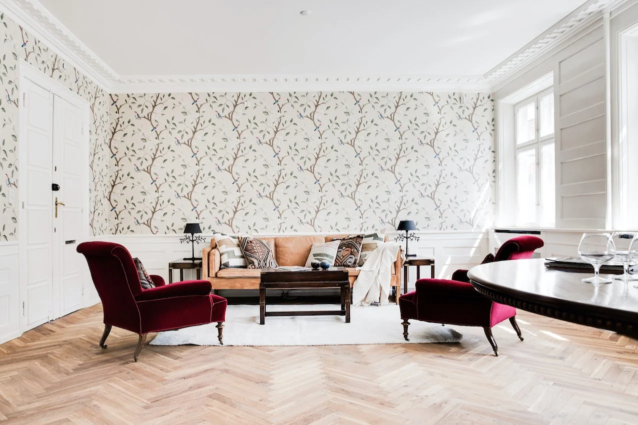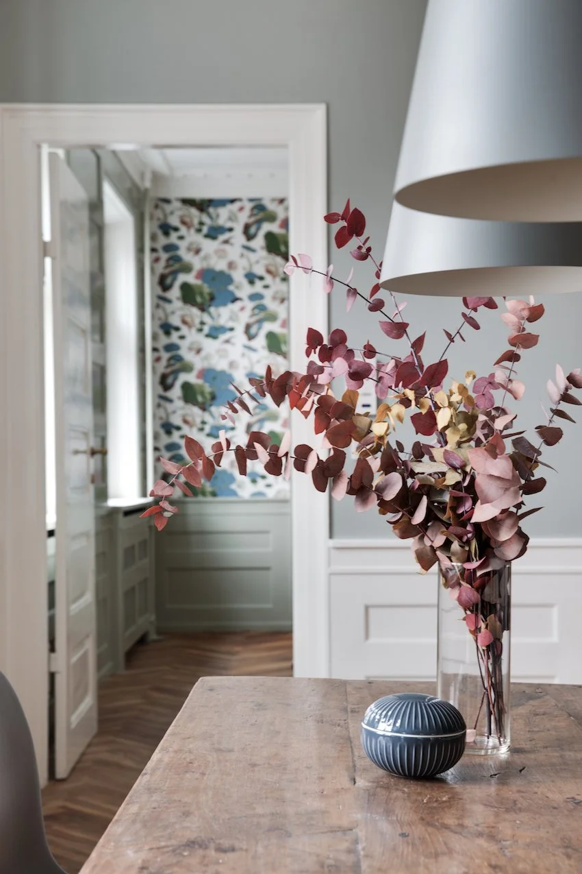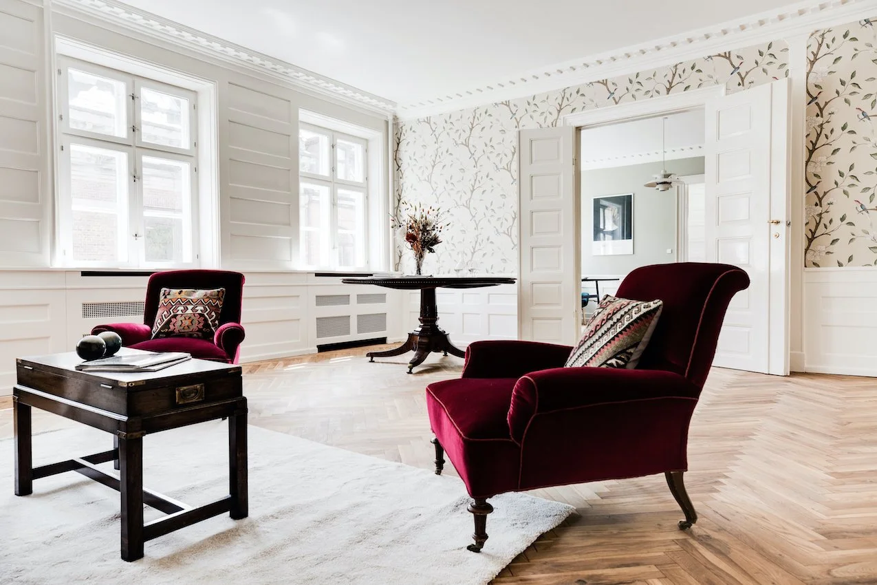 Stilen fortsætter inde i lejligheden, hvor den løftes til et endnu højere niveau. Her venter et eksklusivt hjem på 202 kvm, som er renoveret til perfektion, men med sans for de herskabelige detaljer. Hjemmets udsøgte materialer, som det smukke sildebensparket i eg, og de velvalgte farver og tapeter fra Tapet Café, får lejligheden til at fremstå som et unikt og personligt hjem.