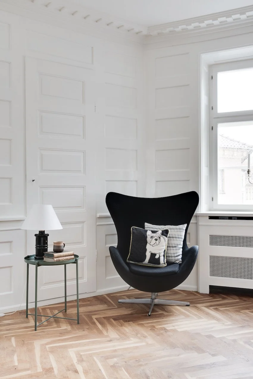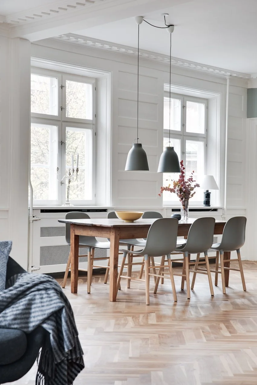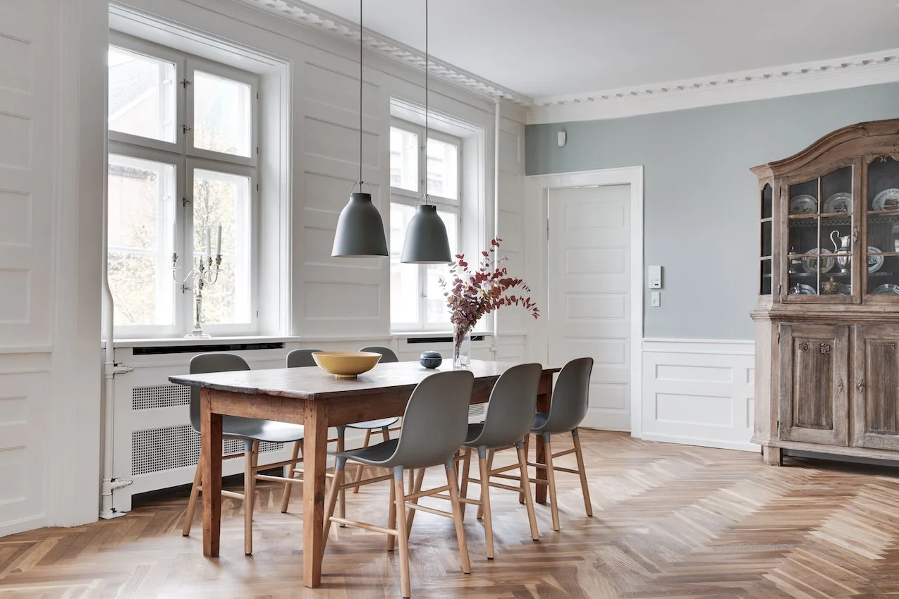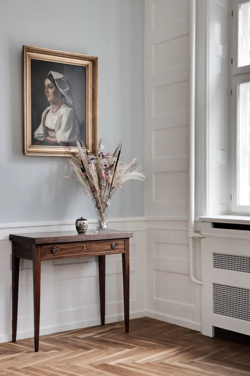 Stilen fortsætter inde i lejligheden, hvor den løftes til et endnu højere niveau. Her venter et eksklusivt hjem på 202 kvm, som er renoveret til perfektion, men med sans for de herskabelige detaljer. Hjemmets udsøgte materialer, som det smukke sildebensparket i eg, og de velvalgte farver og tapeter fra Tapet Café, får lejligheden til at fremstå som et unikt og personligt hjem.