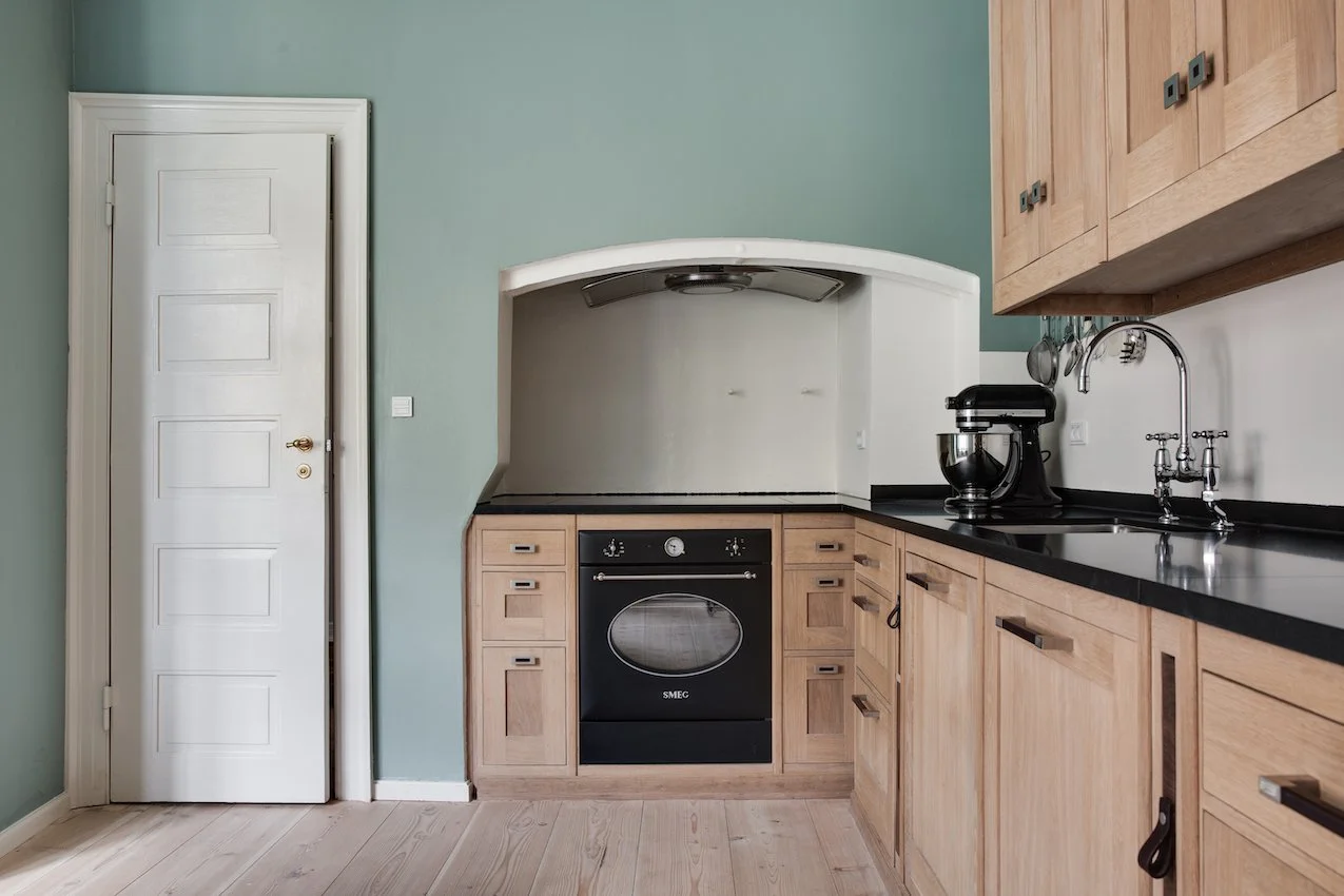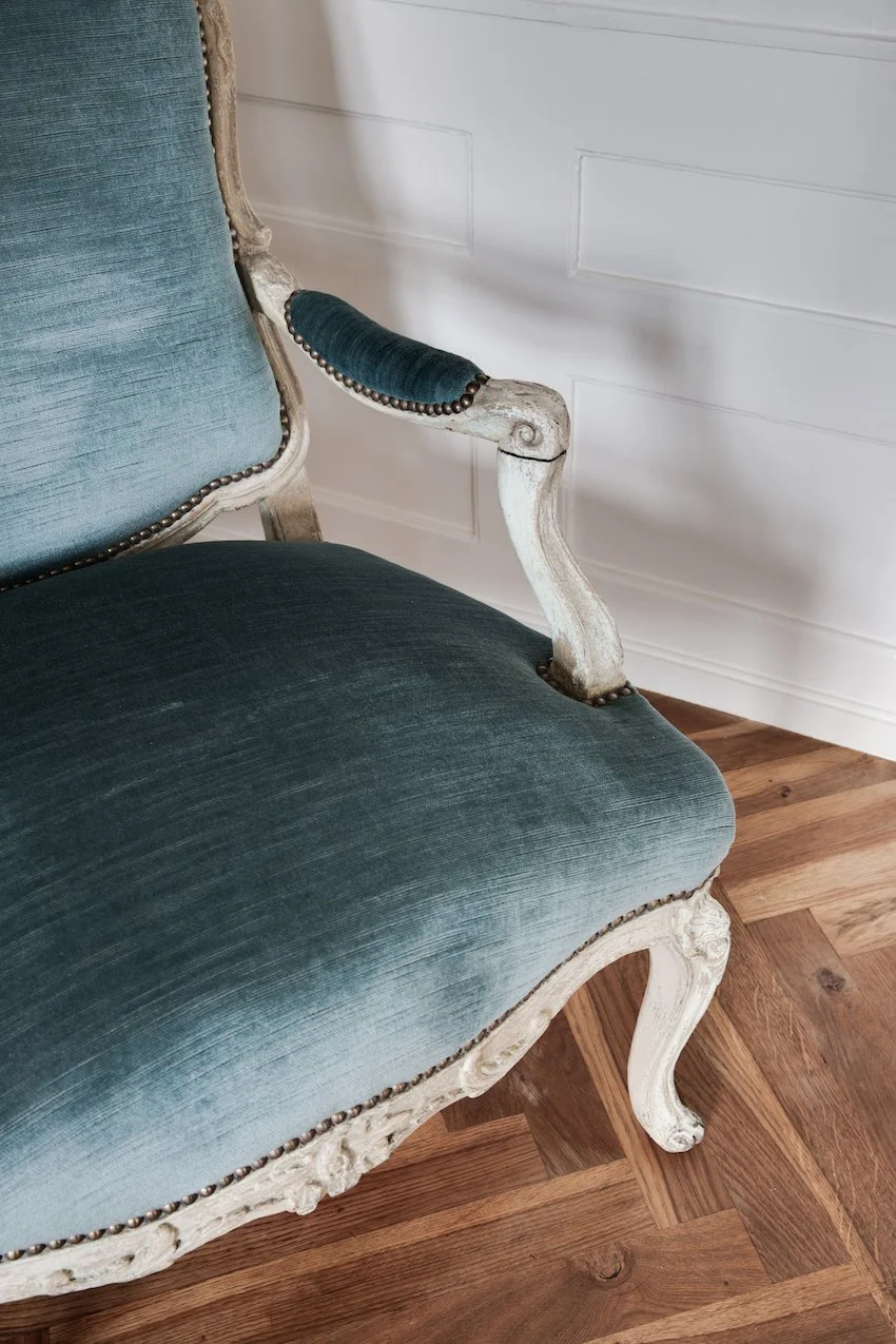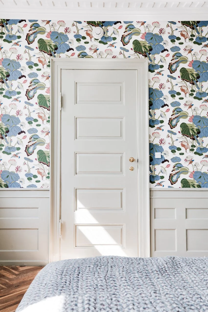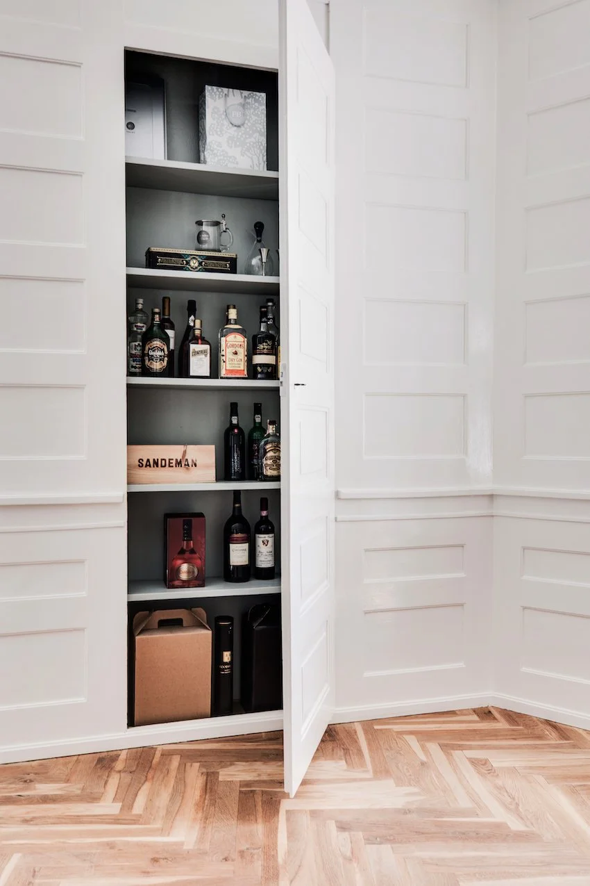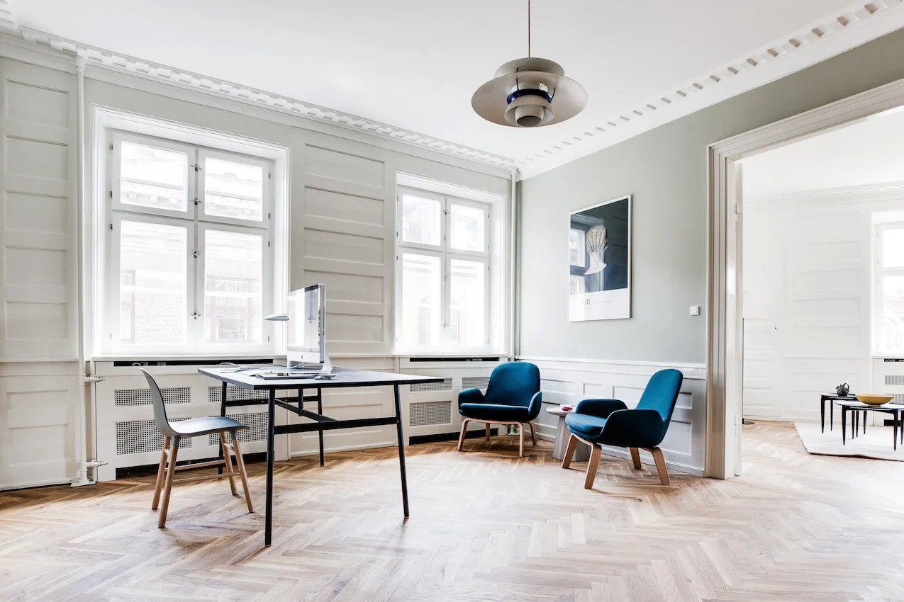 Stilen fortsætter inde i lejligheden, hvor den løftes til et endnu højere niveau. Her venter et eksklusivt hjem på 202 kvm, som er renoveret til perfektion, men med sans for de herskabelige detaljer. Hjemmets udsøgte materialer, som det smukke sildebensparket i eg, og de velvalgte farver og tapeter fra Tapet Café, får lejligheden til at fremstå som et unikt og personligt hjem.