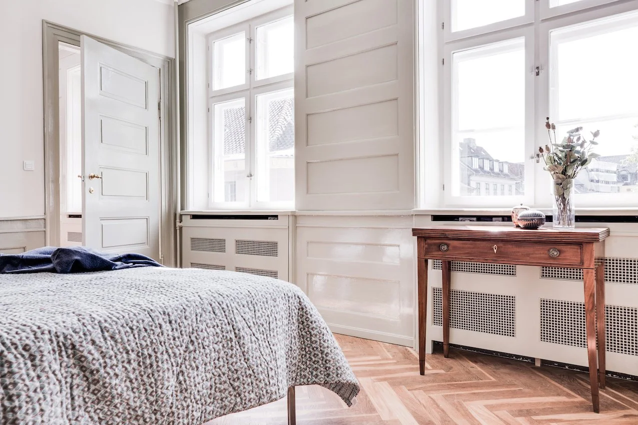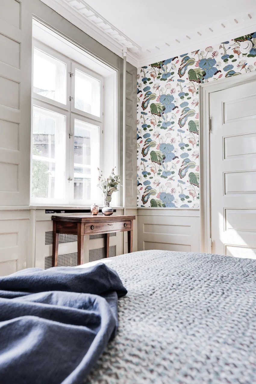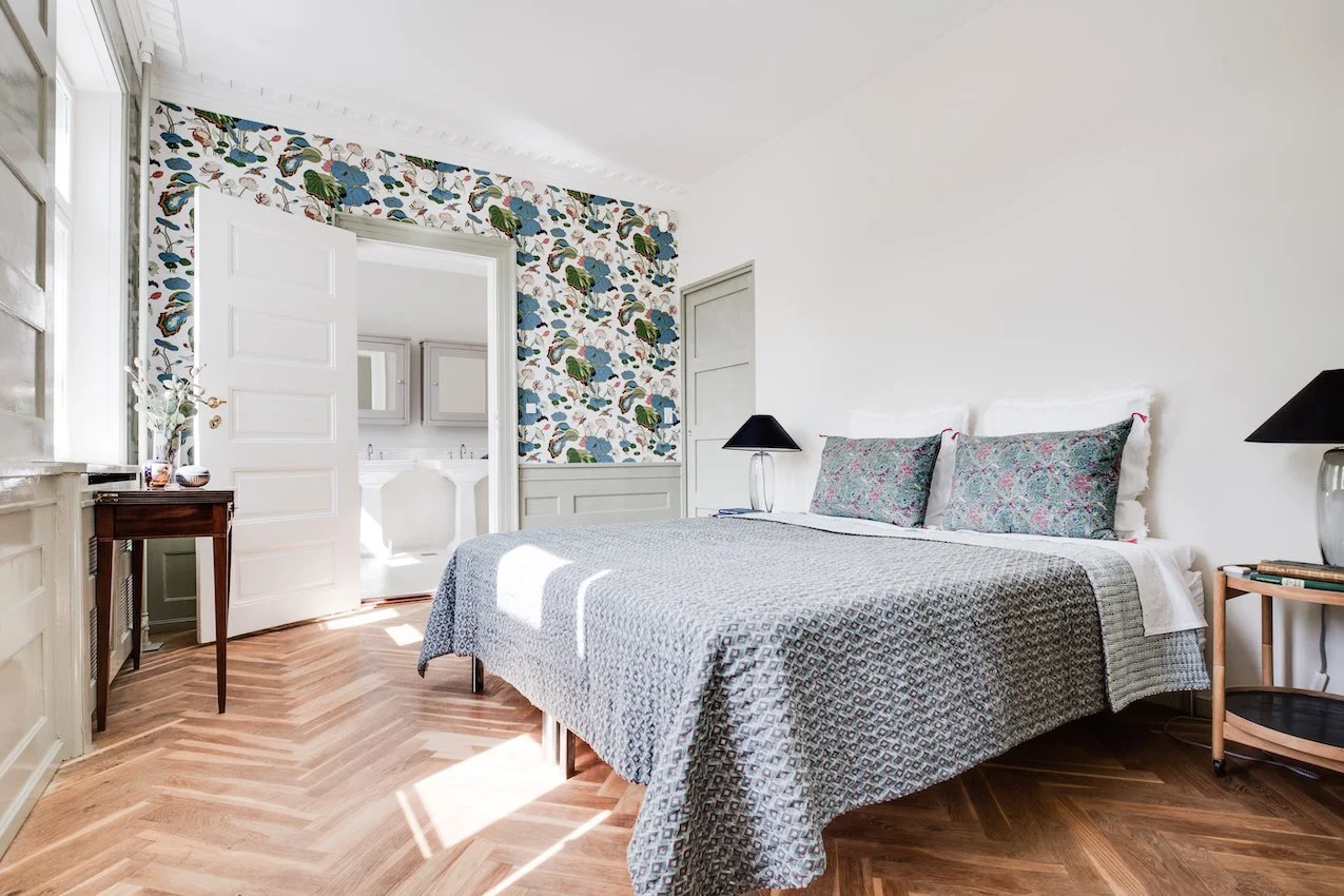 Lejlighedens drømmesoveværelse charmerer med blomstret tapet, og et tilhørende luksuriøst badeværelse. Fra badeværelsets fritstående badekar kan du nyde udsigten over Vor Frue Kirke. I soveværelset er der desuden direkte adgang til en walk-in closet med vaskemaskine.