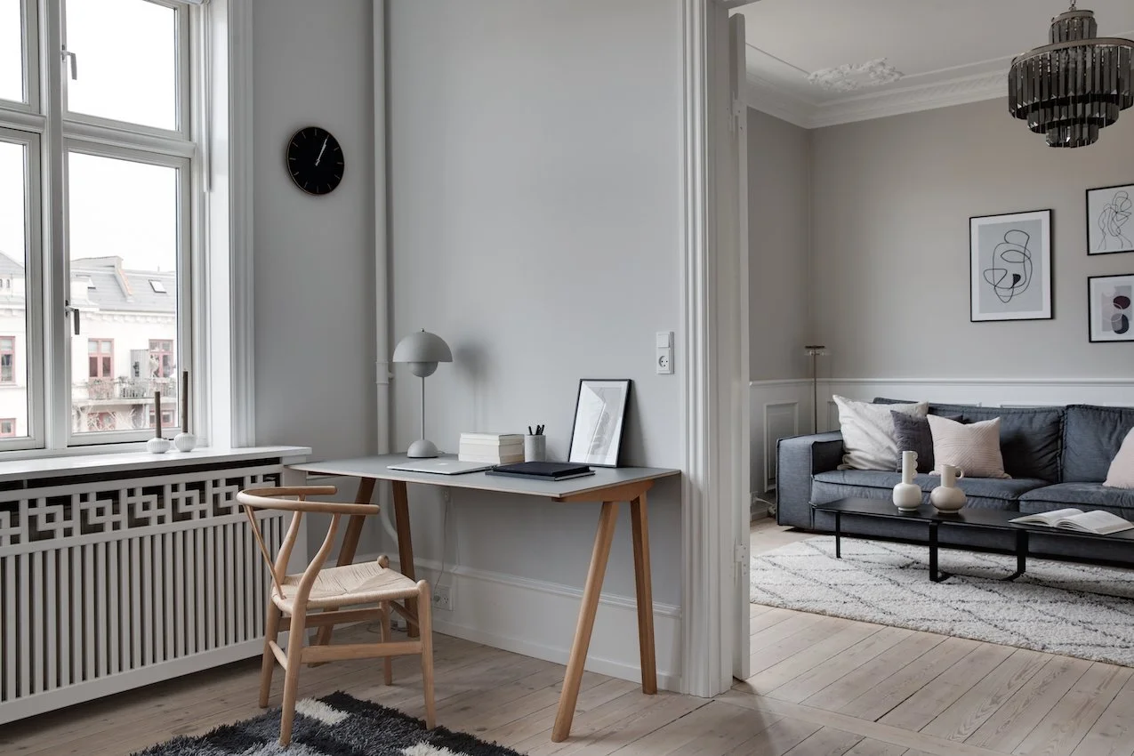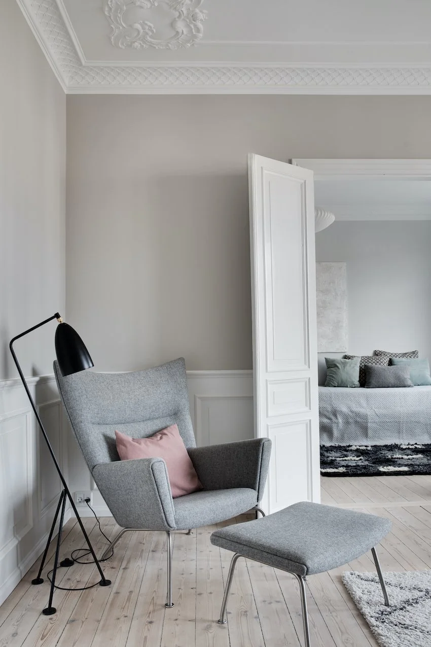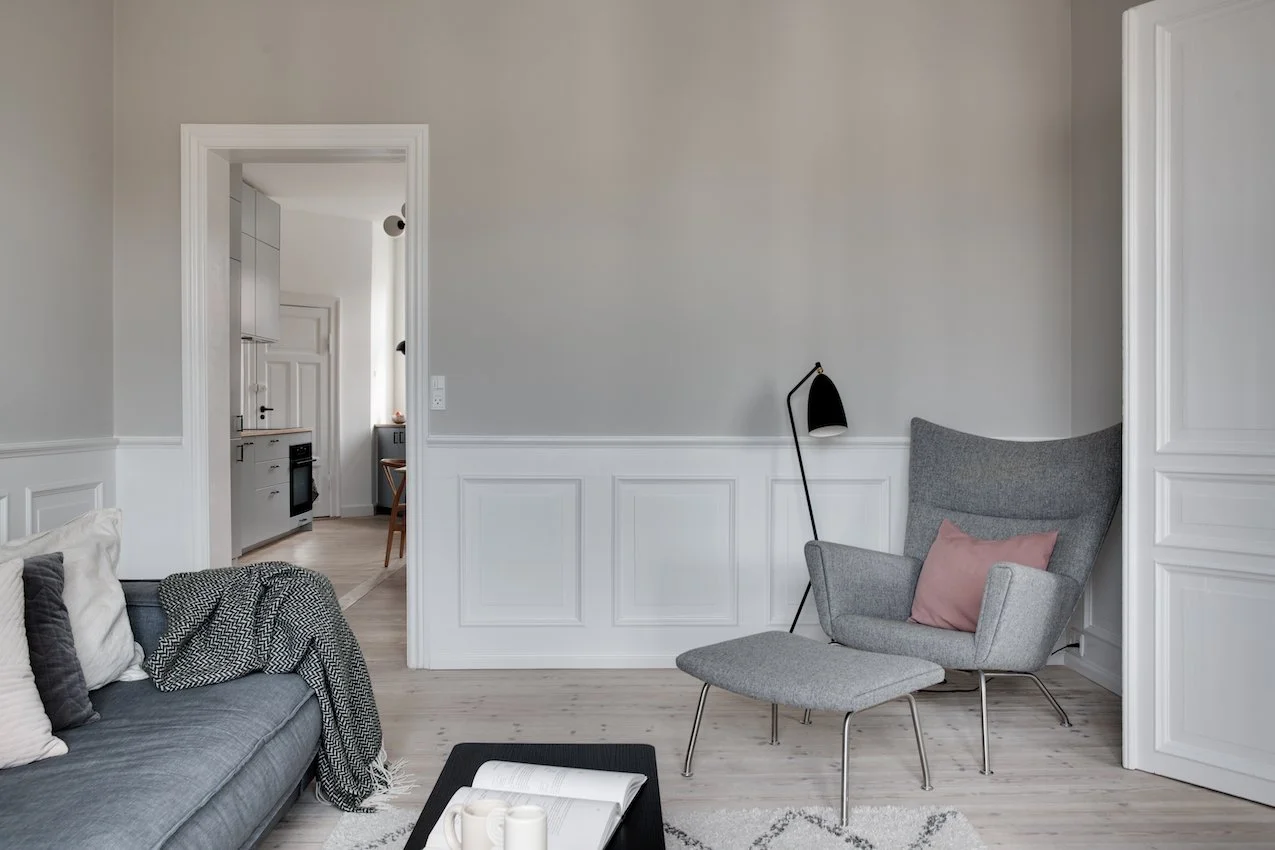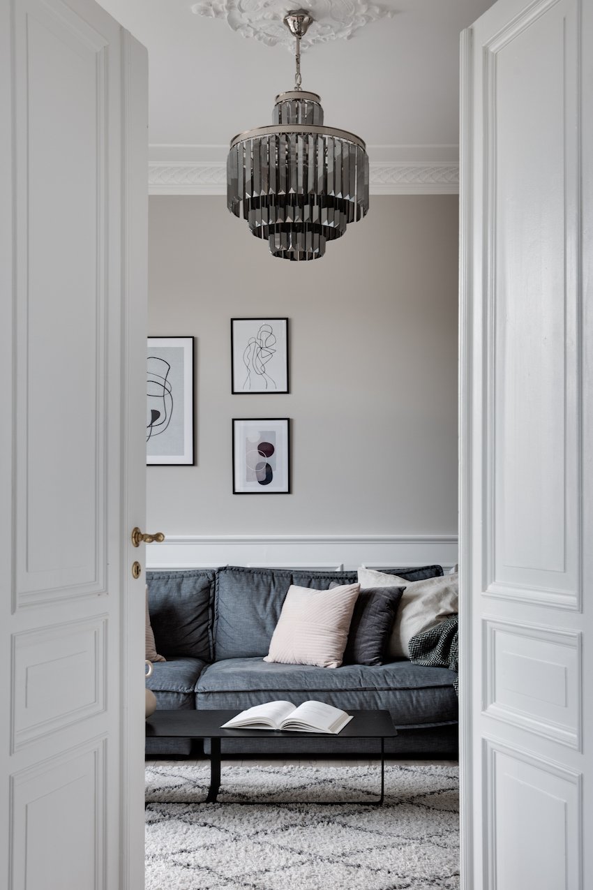 Behagelige grå og beige nuancer fremhæver de nye dekorative paneler og den originale stukkatur, som er blevet restaureret til perfektion. Lejligheden er desuden blevet forkælet med et lækkert stilrent lysegråt køkken, der sætter et moderne præg på helheden.