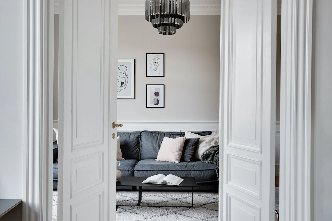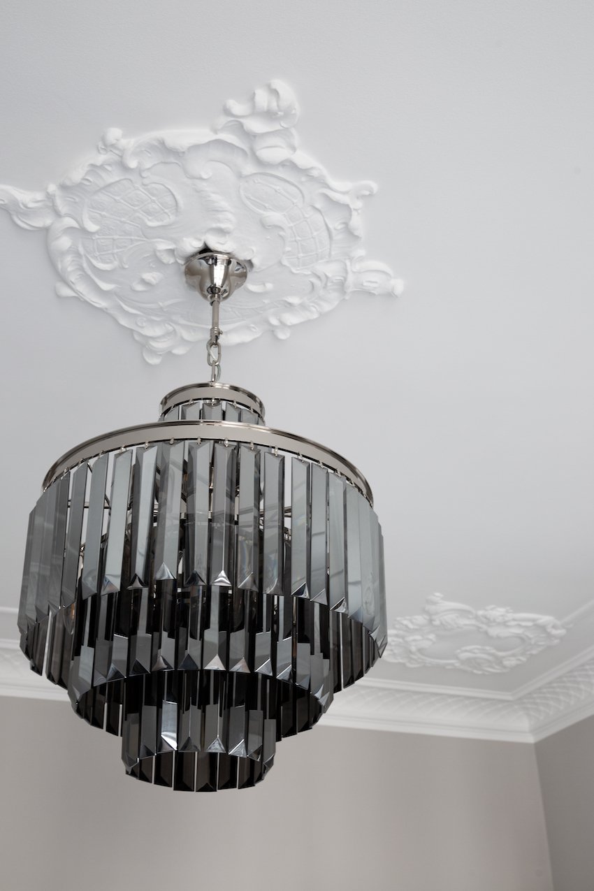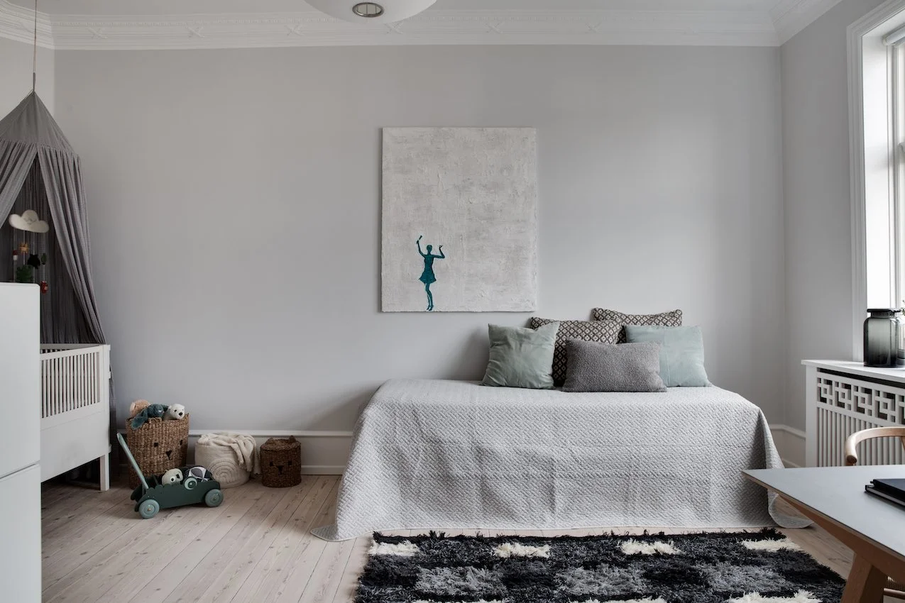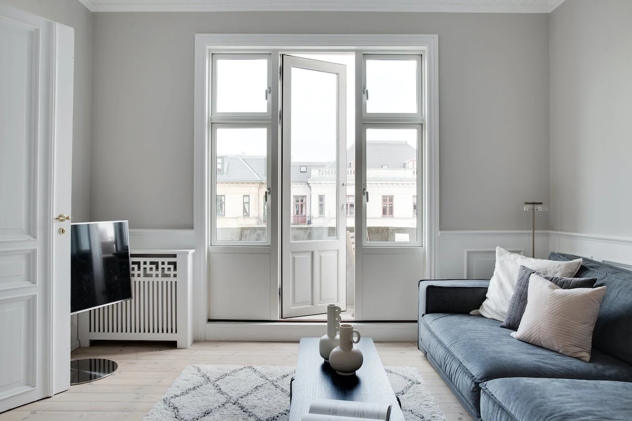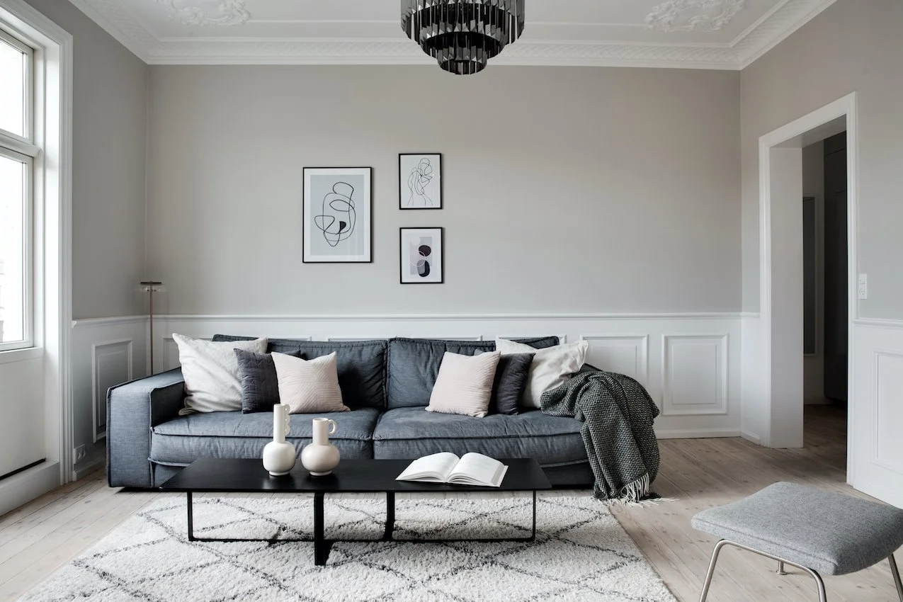 Behagelige grå og beige nuancer fremhæver de nye dekorative paneler og den originale stukkatur, som er blevet restaureret til perfektion. Lejligheden er desuden blevet forkælet med et lækkert stilrent lysegråt køkken, der sætter et moderne præg på helheden.