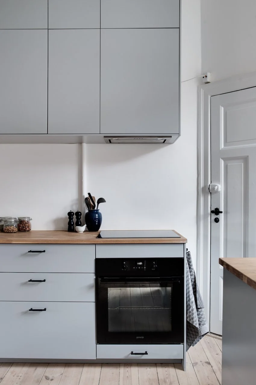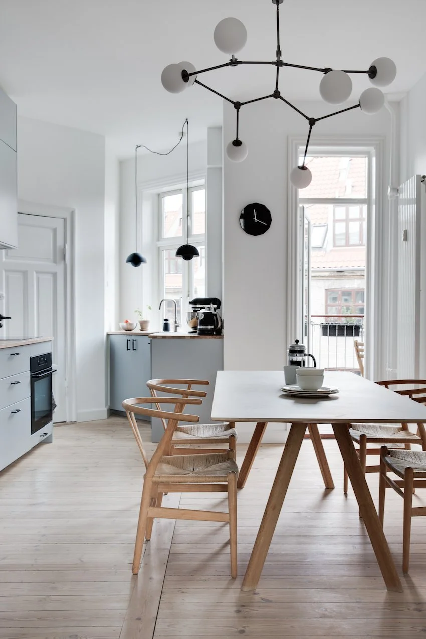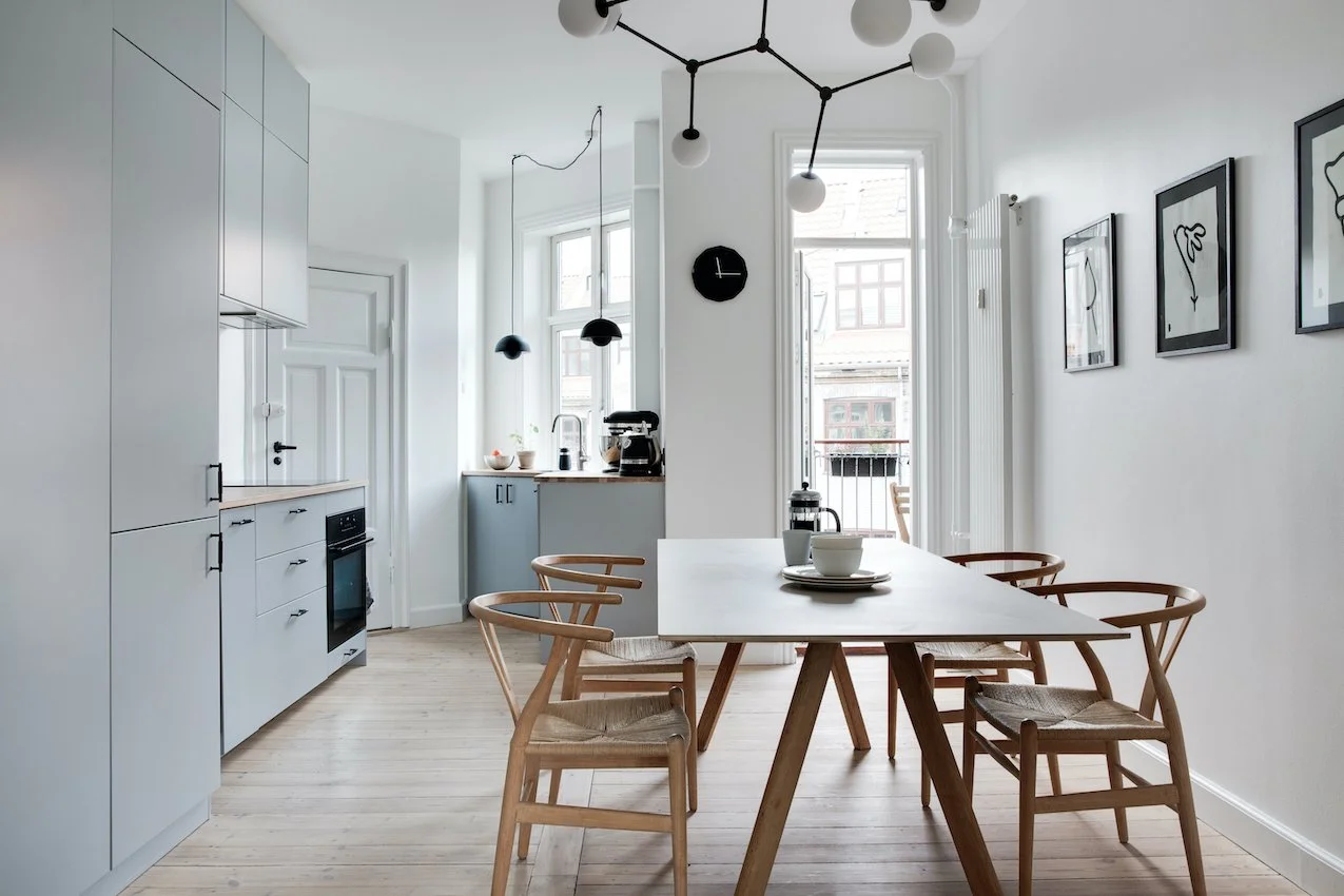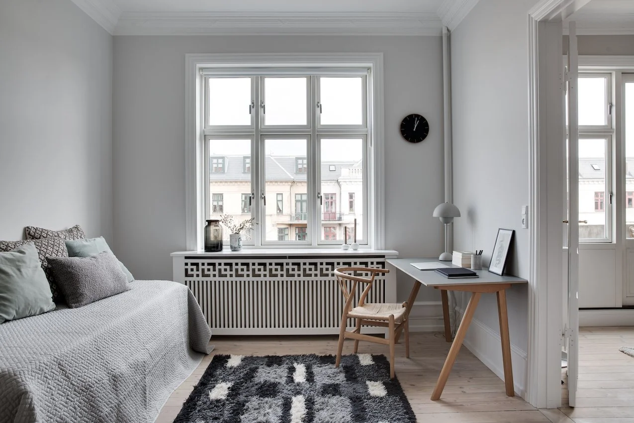 Behagelige grå og beige nuancer fremhæver de nye dekorative paneler og den originale stukkatur, som er blevet restaureret til perfektion. Lejligheden er desuden blevet forkælet med et lækkert stilrent lysegråt køkken, der sætter et moderne præg på helheden.